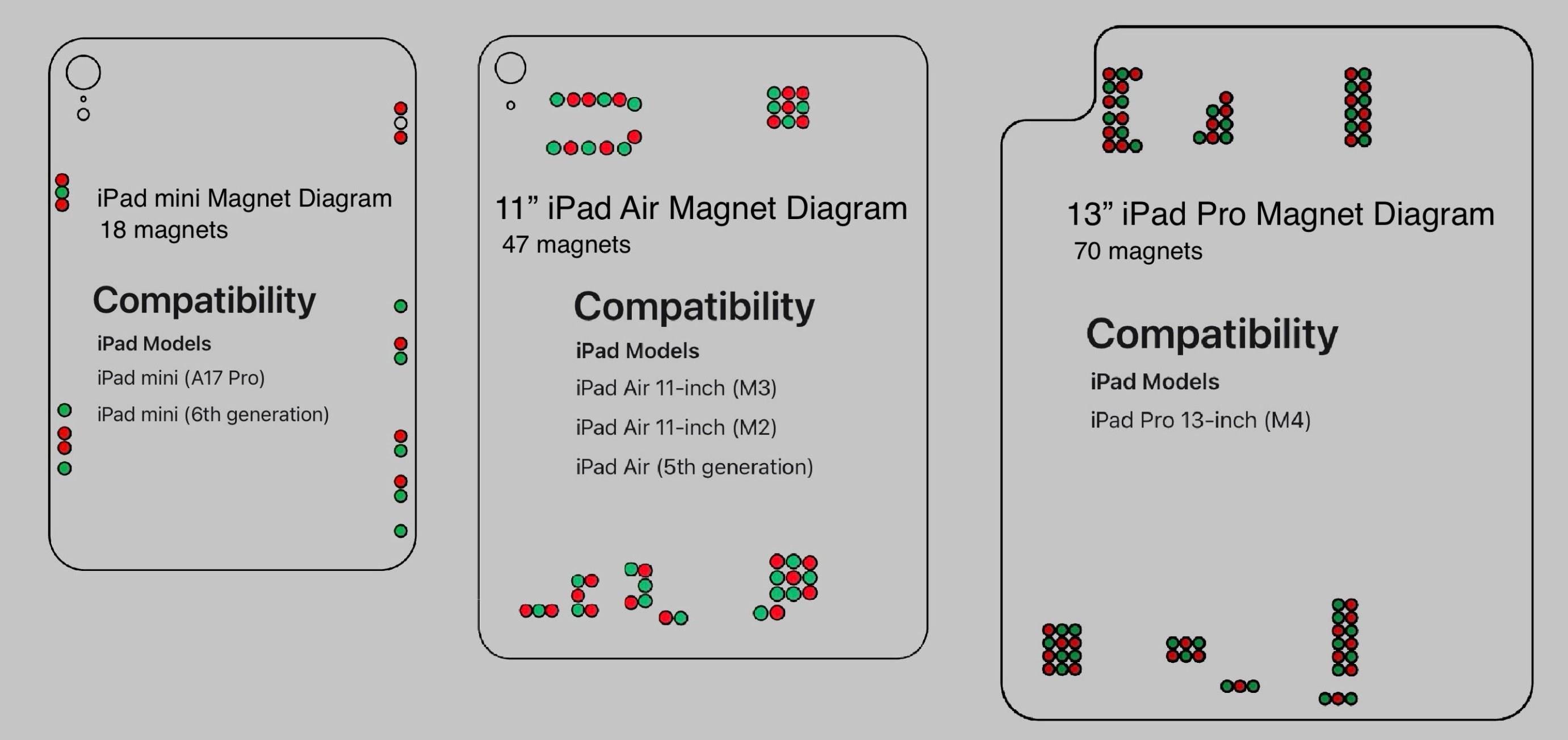 Graphic is based on the 11" Air but you can refer to the next photo for the magnet array of the iPad mini and 13" iPad Pro